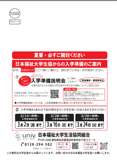 合格者の方に、生協加入のご案内をはじめとした各種生協からの資料を送付いたします。2月14日に、入学準備資料を発送しました。