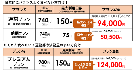 ・生協食堂にてカレンダーに基づき、年間150日または前期75日間、食事を提供するサービスです。
