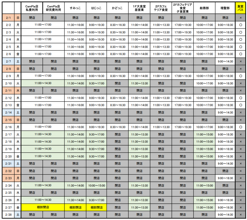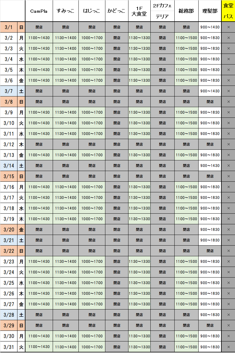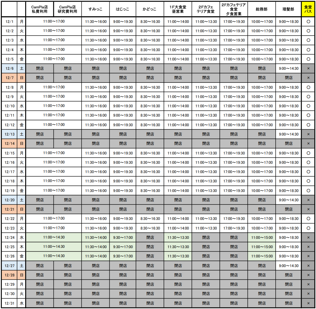 | CamPla店(大学会館2階) | 11:00~14:30 土日祝 閉店 |