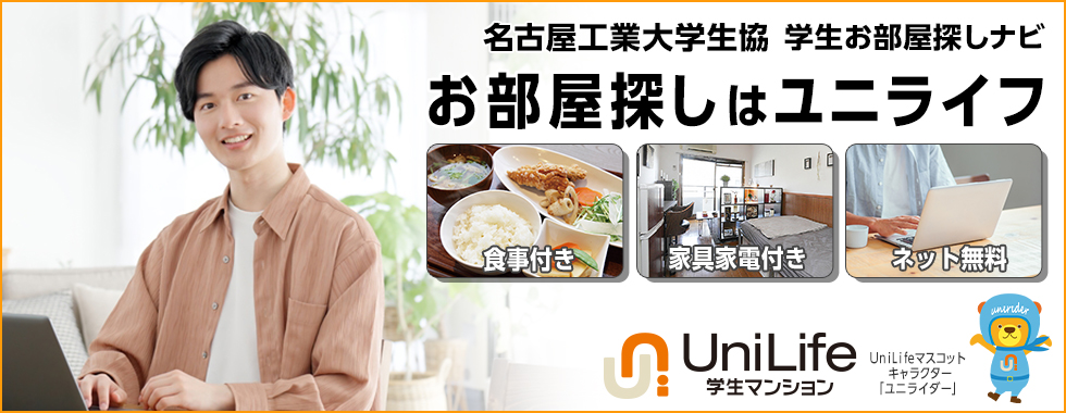 名工大生協では、オリジナルマンションのほかに、学生専用物件を取り揃える株式会社学生情報センター(ナジック)、ジェイ・エス・ビー・ネットワーク(Unilife)とも提携しております。ページ上部掲載の住まいカタログ、もしくは以下WEBサイトからご覧ください。
