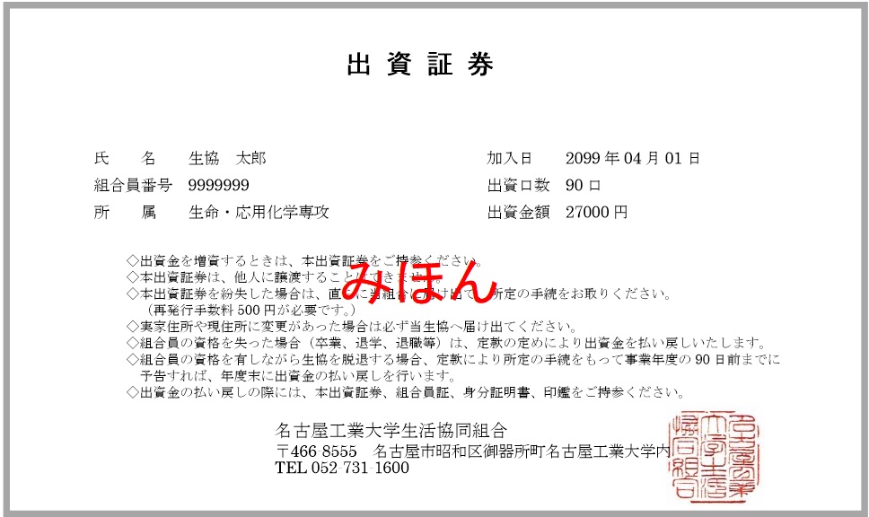 組合員証と出資証券の見本は下記をご参照ください。出資証券はいくつか種類がございます。※左上(出資証券:A5サイズ)、右上(組合員証:名刺サイズ)、左下(出資証券:A5サイズ)