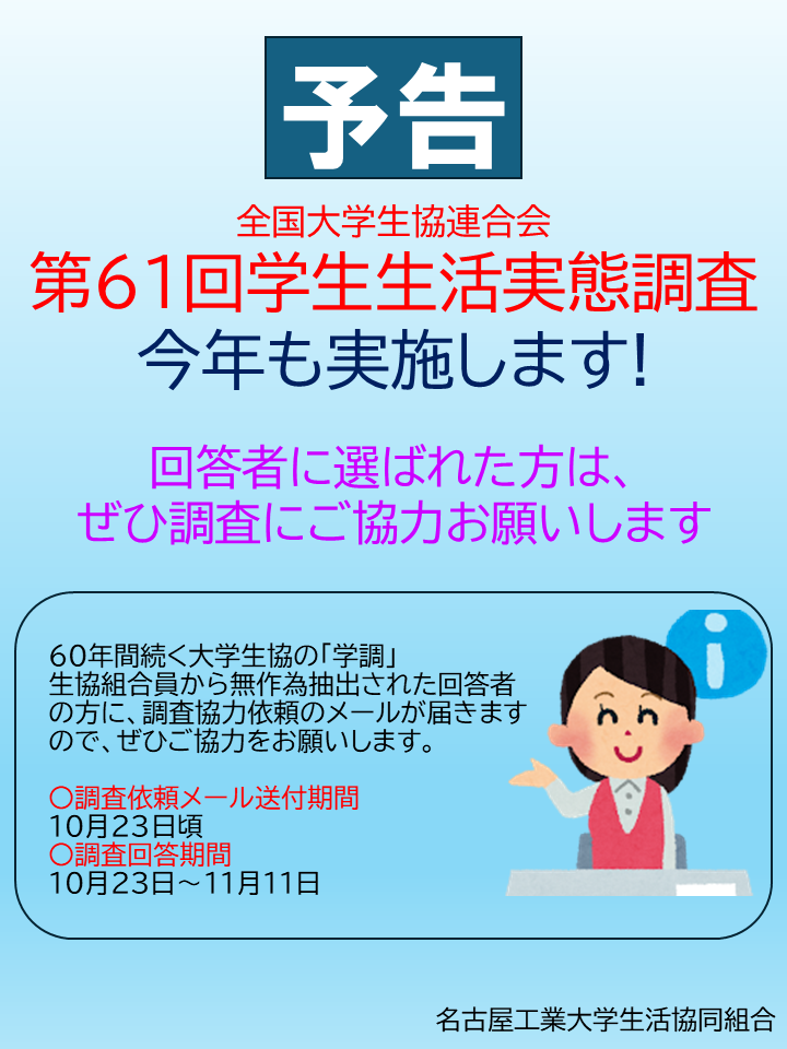 10月23日頃から、名工大生協の中から無作為抽出により選ばれた回答者の方に、メールで調査協力依頼のメールが届きますので、ぜひご協力をお願いいたします。