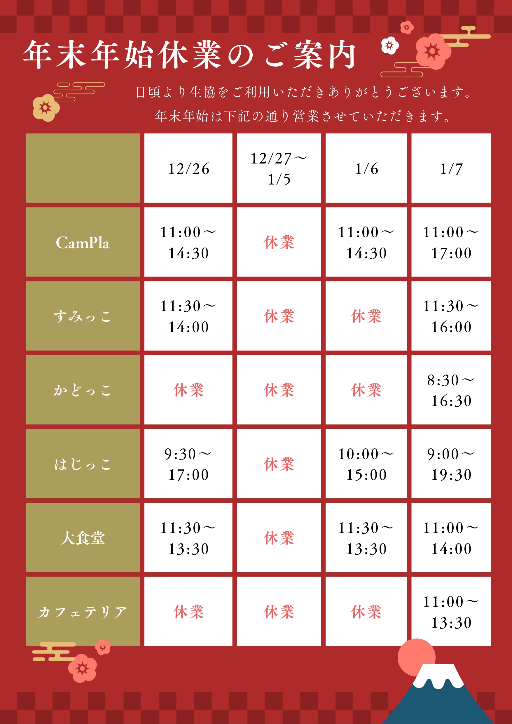 2025年12月19日(金)|お知らせ|教員・大学職員の方へのお知らせ 生協店舗年末年始営業時間のご案内 生協店舗の年末年始営業時間のご案内です 日頃より名工大生協をご利用いただきありがとうございます。 年末年始の生協店舗の営業時間について、以下の通りご案内いたします。