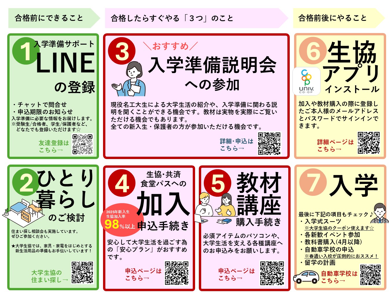 受験生のみなさんへお知らせです|お知らせ|受験生・新入生の方へのお知らせ 合格したらすぐやる「3つ」のことを確認しておこう! 入学準備カレンダーを確認! ①入学準備サポートLINEへの登録 ②ひとり暮らしの準備 ③入学準備説明会への参加