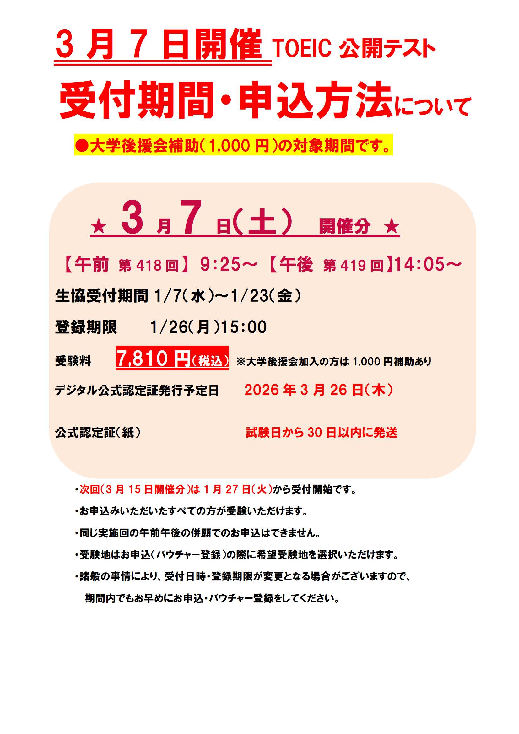 | 3月 | IPマークシート L&R | 3/1(日)14:00~ | 1号館0111教室 | 2/10(火)~2/26(木) |