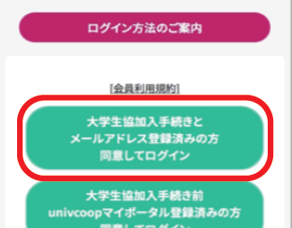 「大学生協加入手続きとメールアドレス登録済みの方 同意してログイン」を選択します