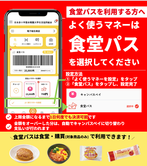 2026年04月01日(水)|お知らせ|受験生・新入生の方へのお知らせ 【重要】 食堂パスお申込みのみなさまへ 大学生協アプリの設定をお忘れなくお願いします。 食堂パスをご利用いただくには大学生協アプリの設定が必要です。 よく使うマネーより食堂パスをご選択ください。一度ご選択いただくと設定変更は不要です
