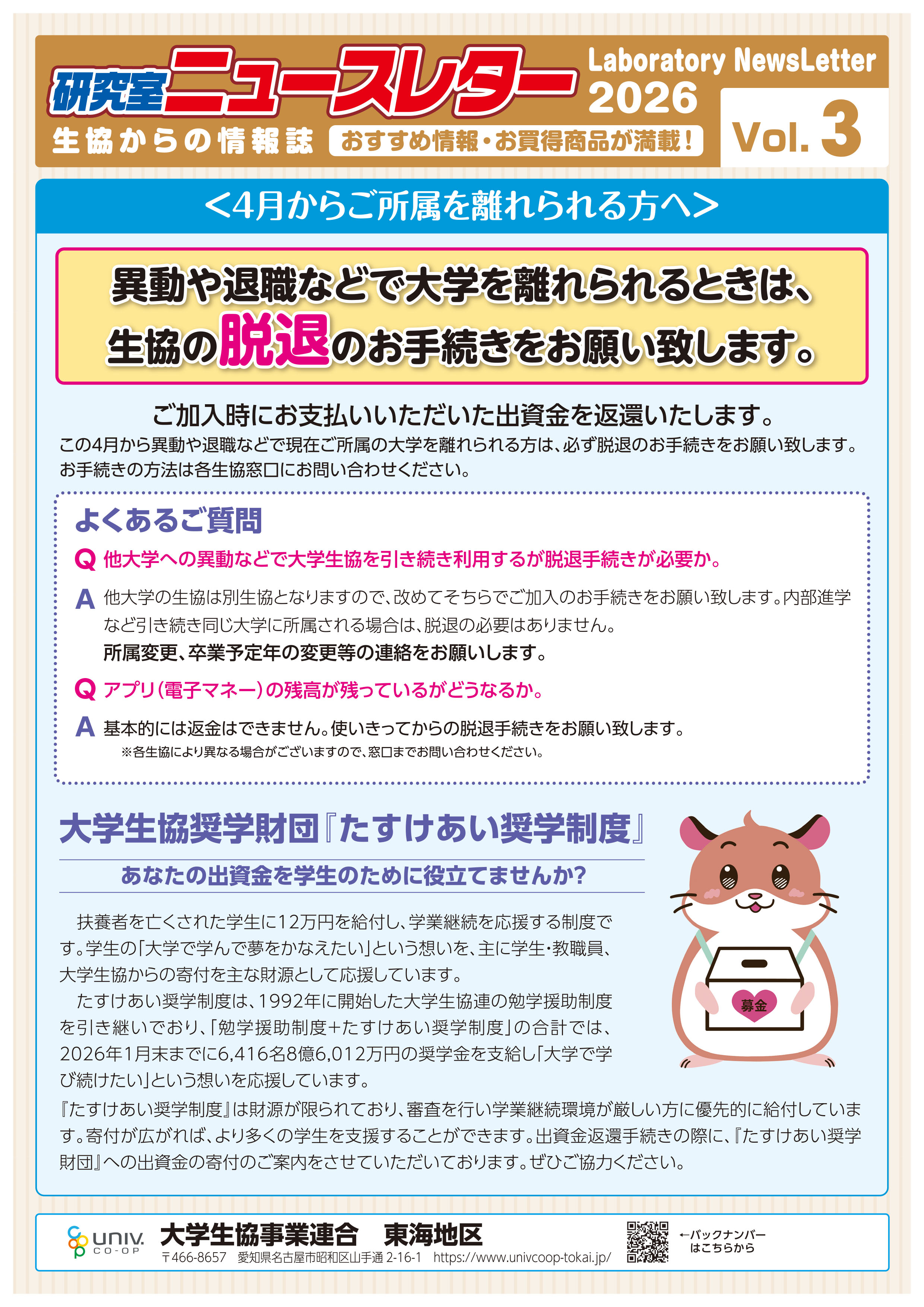 研究室ニュースレターは岐阜・静岡・愛知・三重の大学生協が対象です。