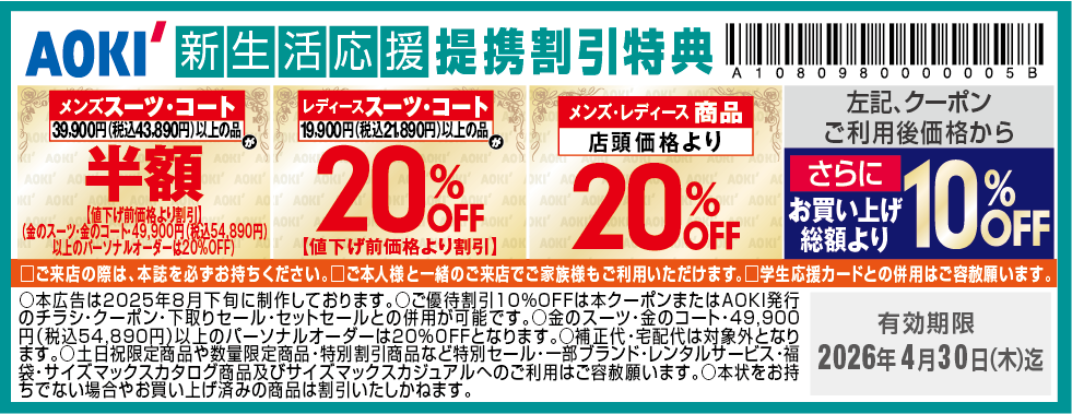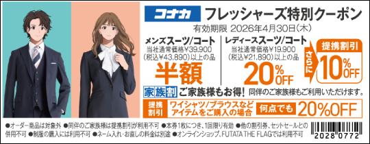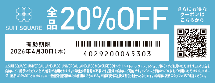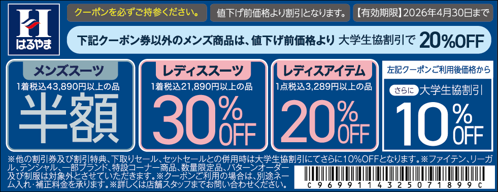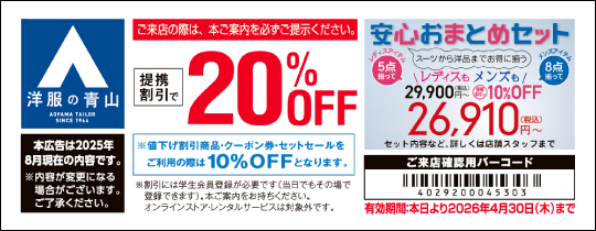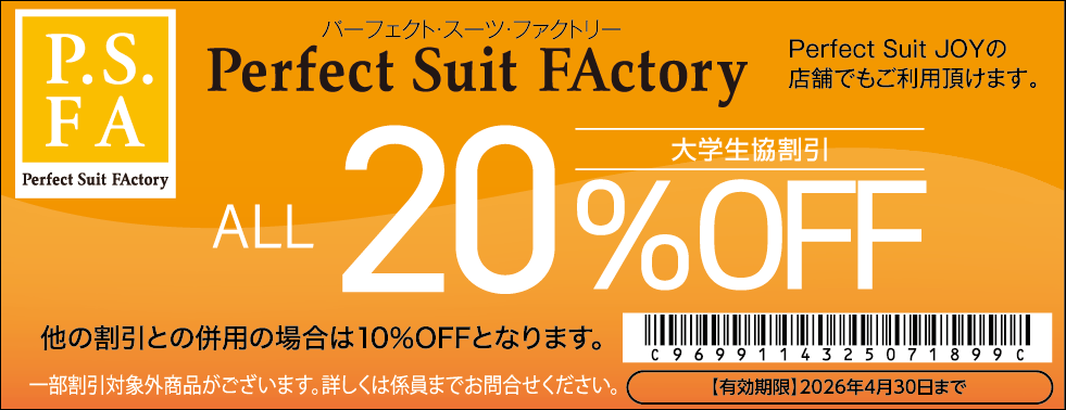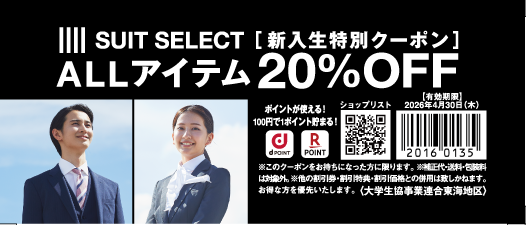 大学生協では、「洋服の青山」「SUIT SQUARE」「はるやま」「P.S.FA」「コナカ」「SUIT SELECT」「AOKI」「名鉄百貨店」と提携し、お得な特典いっぱいでみなさまのご利用を心よりお待ちしています。学生・教職員組合員、ご家族もご利用可能な提携店で使えるクーポン券の提供をしています。