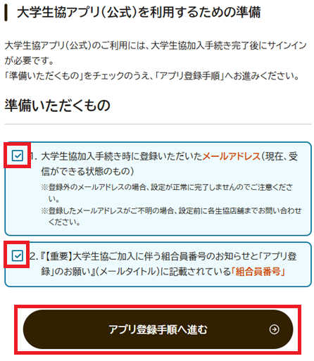 ②大学生協アプリ(公式)登録手順サイトの「大学生協アプリ(公式)を利用するための準備」の「準備いただくもの」をご確認・チェックのうえ「アプリ登録手順へ進む」ボタンをタップ