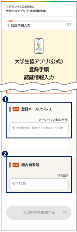 大学生協加入時に登録したメールアドレスと、組合員番号を入力します。