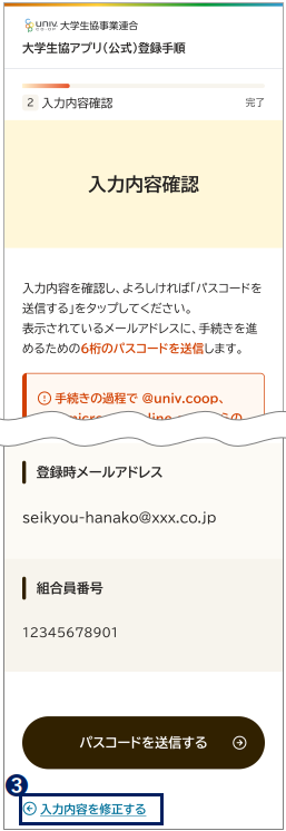 メールアドレスと組合員番号を修正する時は、こちらをタップすると入力画面に戻ることができます。