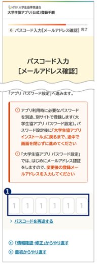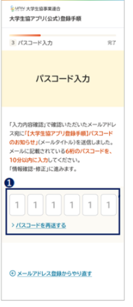 大学生協アプリ登録手順からのメールに記載の6桁のパスコードを入力してください。