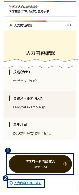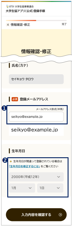 入力内容を確認し、問題なければ❶のボタンををタップしてください。なお、[⑤【3/6】情報確認・修正]でメールアドレスを変更した場合と変更していない場合で、次に表示される画面が異なります。