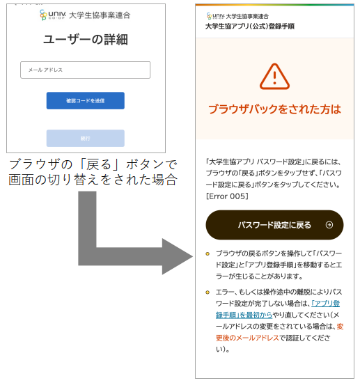 「ブラウザバックをされた方は」に移動した場合は、画面の説明に従って、パスワードの設定画面に戻ってください。