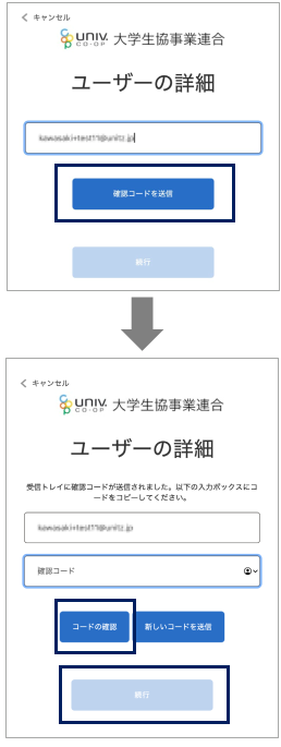 登録メールアドレス宛に届いた6桁の確認コードを「確認コード」欄に入力し、「コードの確認」をタップしてください。