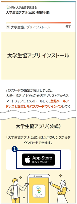 ①生協加入後に届く『【重要】大学生協ご加入に伴う組合員番号のお知らせと「アプリ登録」のお願い』 メールタイトル 内の大学生協アプリ(公式)登録手順サイトのURL をタップアプリ登録サイト 大学生協アプリ(公式)登録手順