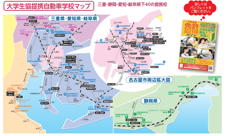 | 24 | 中部日本自動車学校 | 名古屋東部 | 地下鉄八事日赤駅よりスクールバス5分、八事駅より6分 | 名大・名工大・名市大・中京大(名古屋)・名城大・南山大 | ||