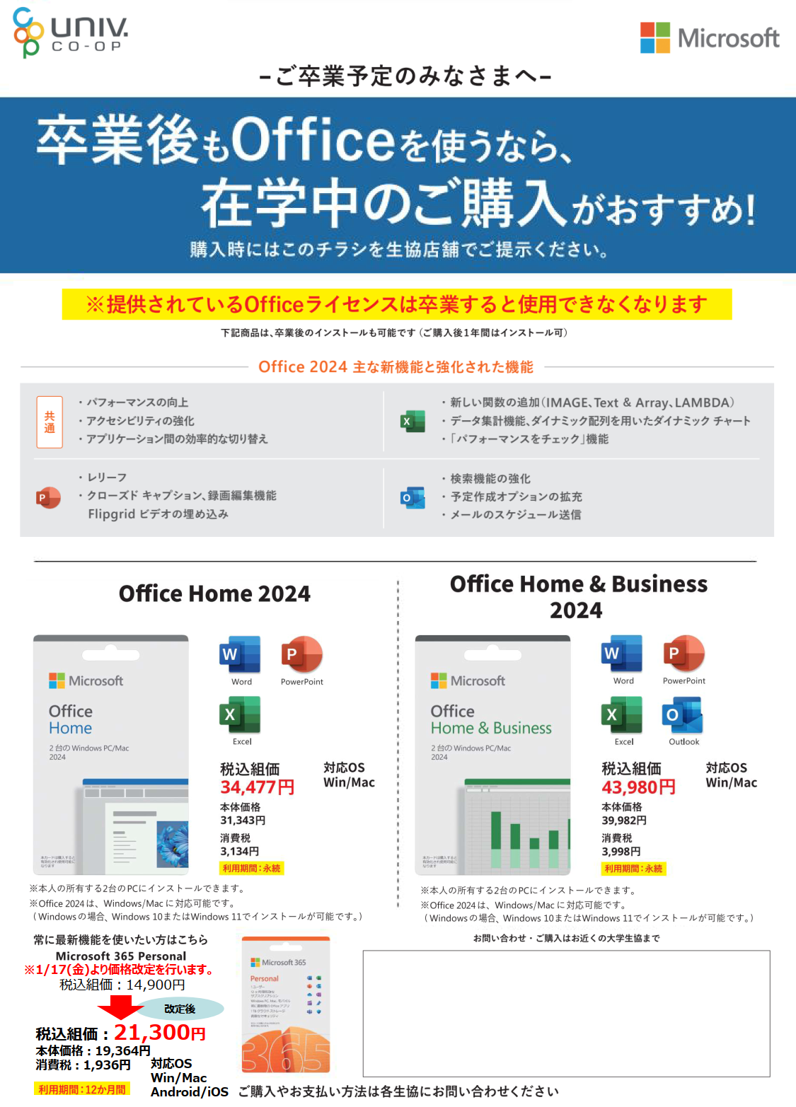 詳しくは大学生協ソフトウェアインフォメーション、または生協店舗まで気軽にご相談ください。