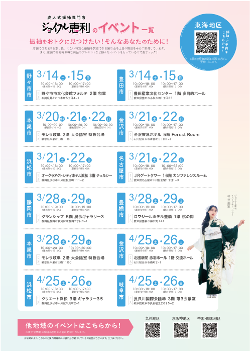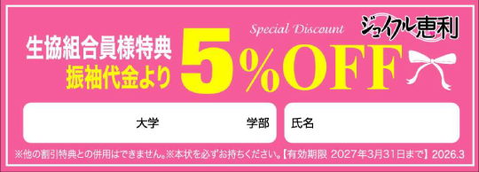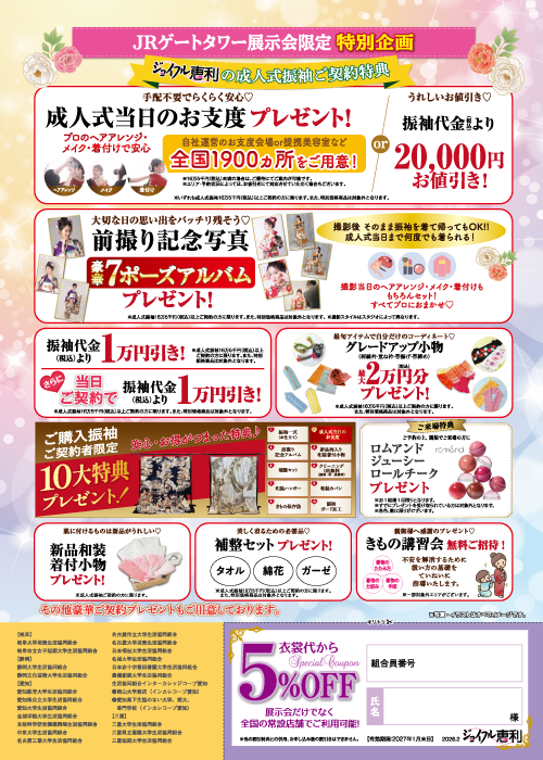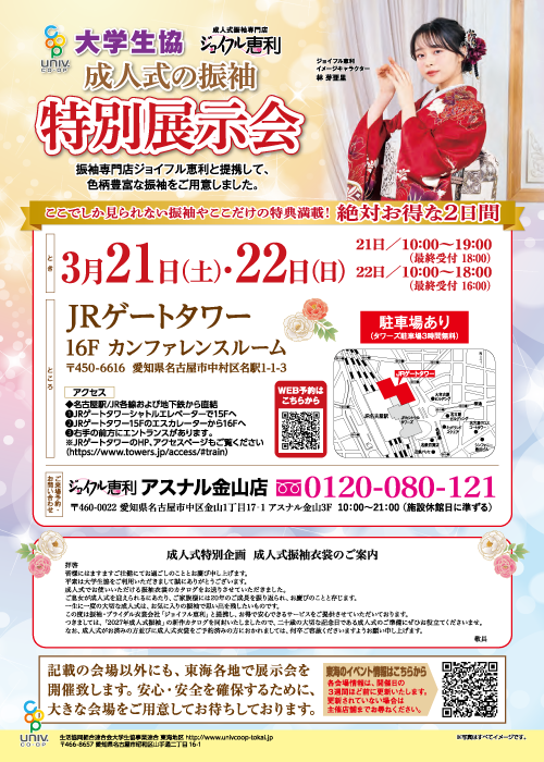 | 特別展示会にご来場いただけない皆様は、衣裳会社「ジョイフル恵利」の店舗で衣裳を選ぶことができます。大学生協「組合員割引」や「前撮り記念写真」「成人式当日のお支度 無料」などの特典もあります。 |