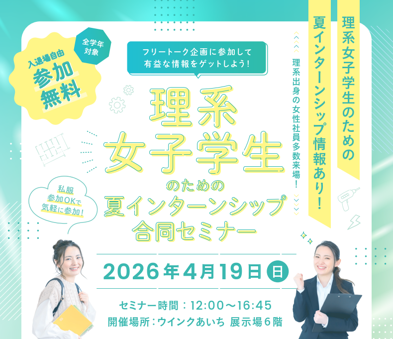 - 4/26(日)・5/16(土)開催 理系学生のための夏インターンシップ&仕事体験合同セミナー