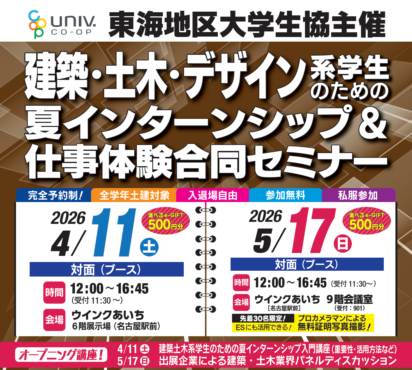 ・参加方法 ・オープニング特別講座 ・参加企業一覧 ・特別企画 ・昨年参加者の声 ・参加特典 ・参加時の注意事項 ・イベント補足事項 ・大学生協主催オススメセミナー5月17日(日) 建築・土木・デザイン系学生のための夏インターンシップ&仕事体験合同セミナー