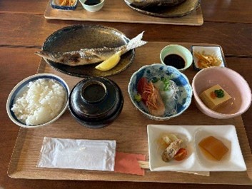 海沿いにある旅館で昼食を取りつつお話を伺いました。ここでの焼き魚は絶品でした。