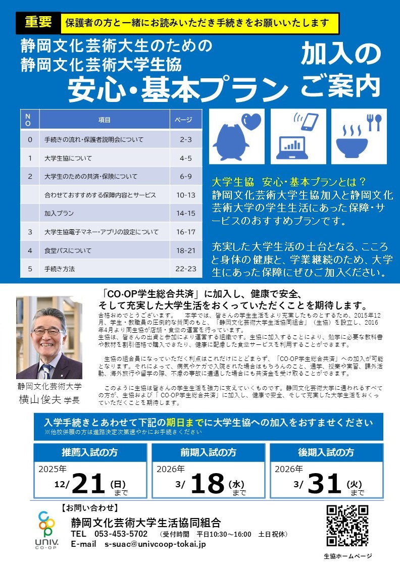 - 静岡文化芸術大学生協は静岡文化芸術大学の学生・職員・教職員の皆様から出資金をお預かりし、その出資金を元にして様々な商品・サービスを提供しています。生協の店舗や食堂、その他サービスの利用は、生協法により当生協に加入のうえ、ご利用願います。