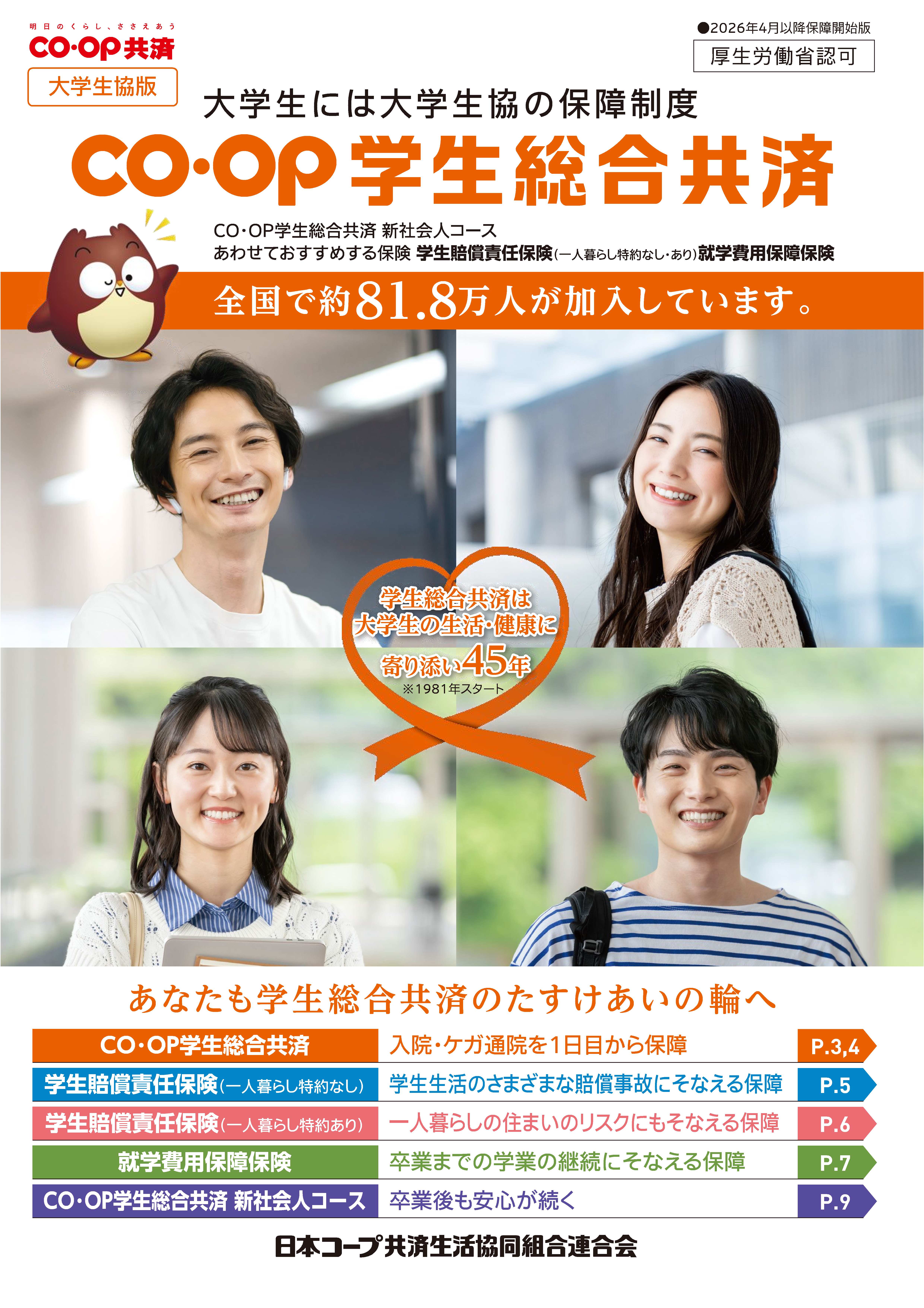- 「大学生」には大学生のための保障制度が必要です。すでに加入の保険・共済があっても、あわせてCO・OP学生総合共済への加入を検討ください。 CO・OP学生総合共済は、学生がもしもの時にも学業を継続できるようにするために作った制度です。保障内容は大学生活に特化したものになっています。今、ご加入の保険は、学業継続のために十分な保障になっていますでしょうか。 CO・OP学生総合共済は他の保険や共済から保険金・共済金が支払われた場合でも共済金請求手続きはできますので、ご安心ください。また、学生総合共済の掛金は、自分のためだけでなく、全国約81.8万人の仲間のためにも使われます。健康で安全な大学生活を送るために困ったときはお互いにたすけあう、そんな「学生どうしのたすけあい」の制度であるCO・OP学生総合共済への加入をぜひ、ご検討ください。