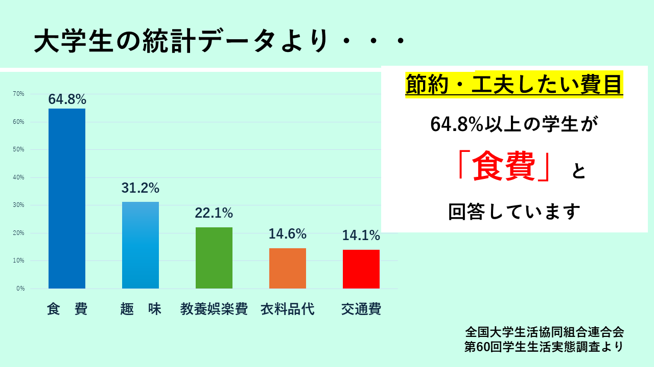 大学生が節約する場合、真っ先に食事を削る傾向があります。生協では食事代を削って食生活の乱れをひきおこさないために、食事にだけ使用できる定期券=「食堂パス」を提案しています。食堂パスの特徴