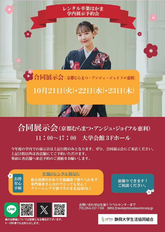2025年09月19日(金)~2025年10月23日(木)|お知らせ 卒業式レンタル袴 合同展示会開催のご案内 【 静岡キャンパス 】 今年度ラストの合同展示会です!! 静岡キャンパス内で試着からご契約までできます。 ぜひ、この機会に!