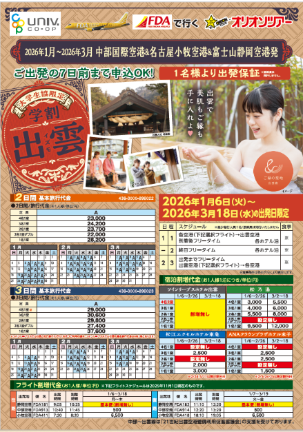 オリオンツアー 学割『 北海道 』 『 出雲 』 2025.12~2026.3