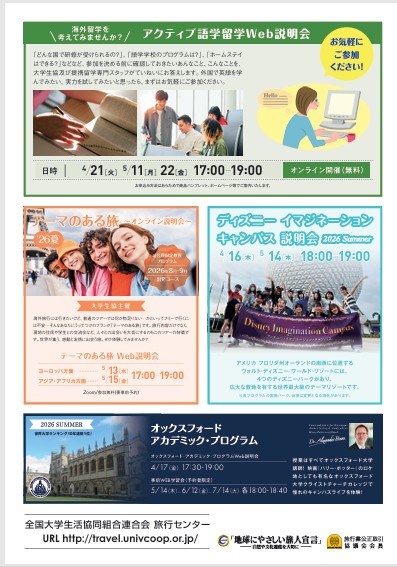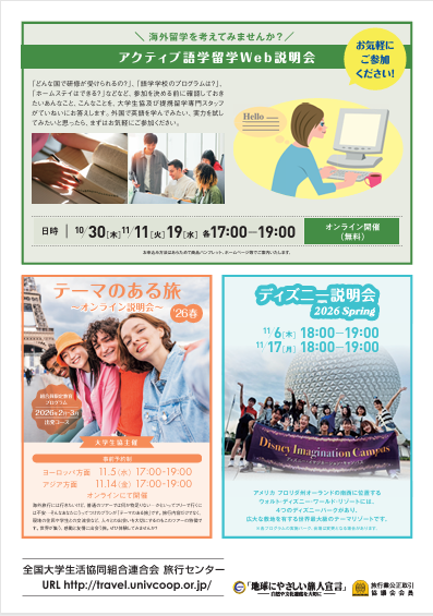 出発が近づいてくると不安が増してくるもの。生協ではアクティブコース参加対象者を中心としたオリエンショーションがオンラインで開催されます。出発間際で不安なことや分からないことを説明いたします。皆さんが自信を持って留学生活を送れるようお手伝いします。
