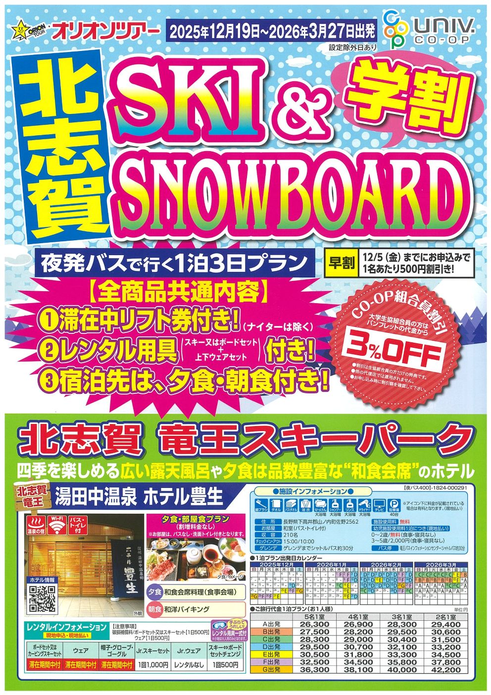 浜松・静岡各キャンパス発着の【 夜発バスで行く1泊3日プラン 】団体のご利用もOK!お申し込みはお早めに。