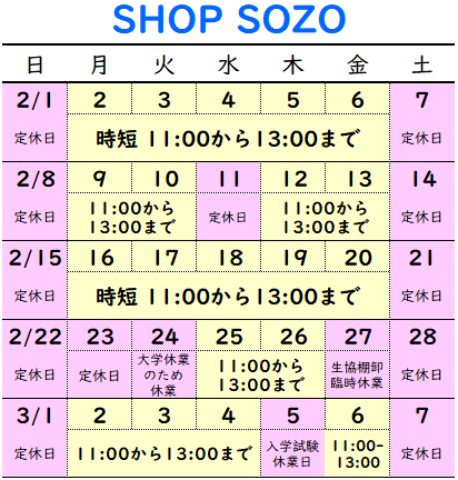 - 4月1日(水)まで、購買SHOP SOZOを春休みのため時短営業(11:00-13:00)いたします。