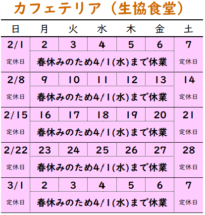 - 4月1日(水)まで、食堂カフェテリアを春休み期間のため休業いたします。